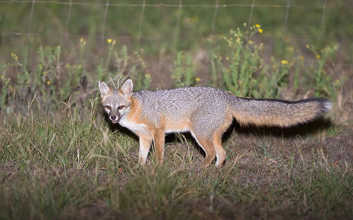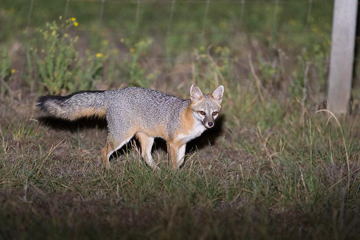 | The Gray Fox in the next 3 shots was hunting along the edge of the yard at a farmhouse at night near Elgin, Bastrop Co., Texas, in September, 2008. These shots were taken with a Canon EOS 1D Mark III and EF 300mm F/4 L IS and Canon 580 flash. | ![]() |