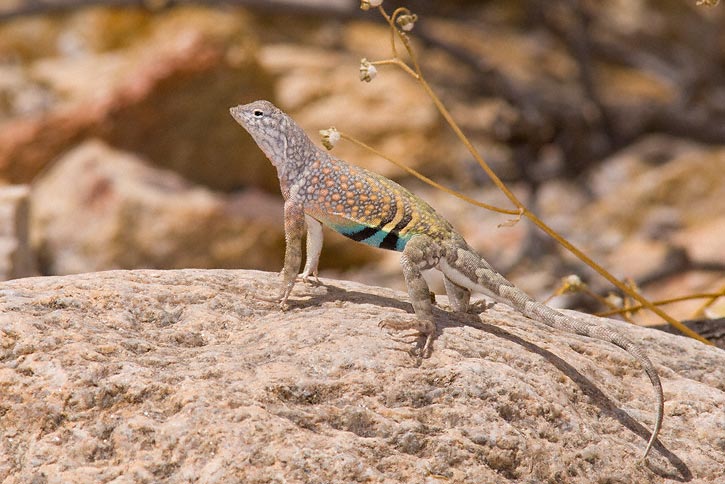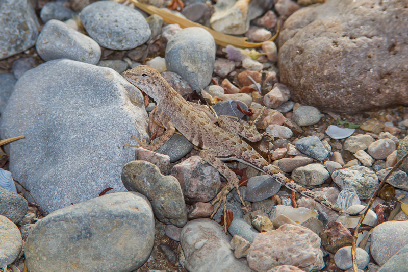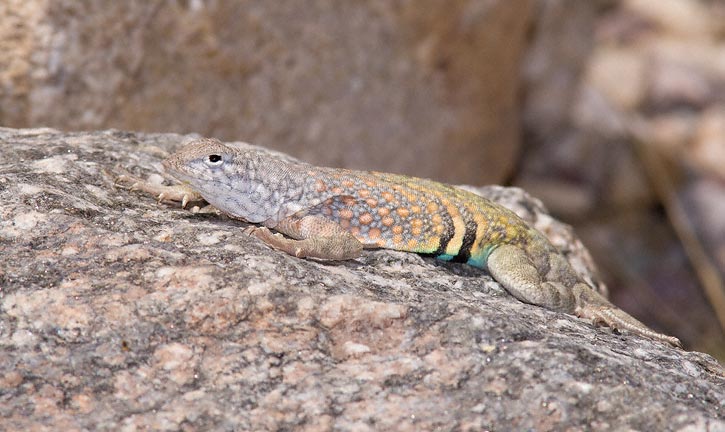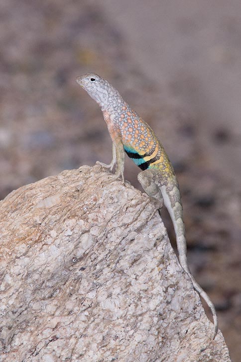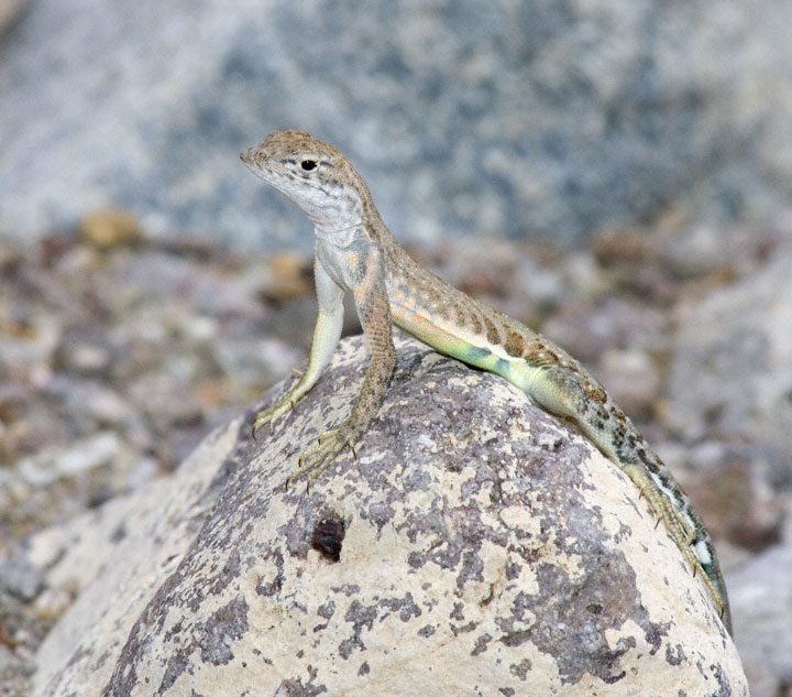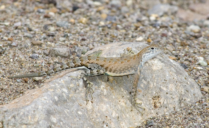 | The Greater Earless Lizard in the next 4 shots was in Sabino Canyon, Tucson, Pima Co., Arizona, in May, 2008. These shots were taken with a Canon EOS 1D Mark III and EF 300mm F/4 L IS lens and 2X extender. In two of the shots the lizard is seen standing up on its tip toes, apparently to avoid the heat of the sun baked rock. | ![]() |