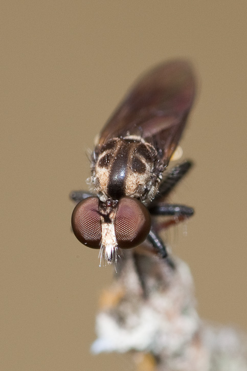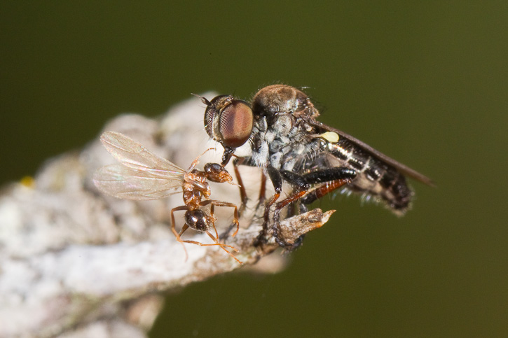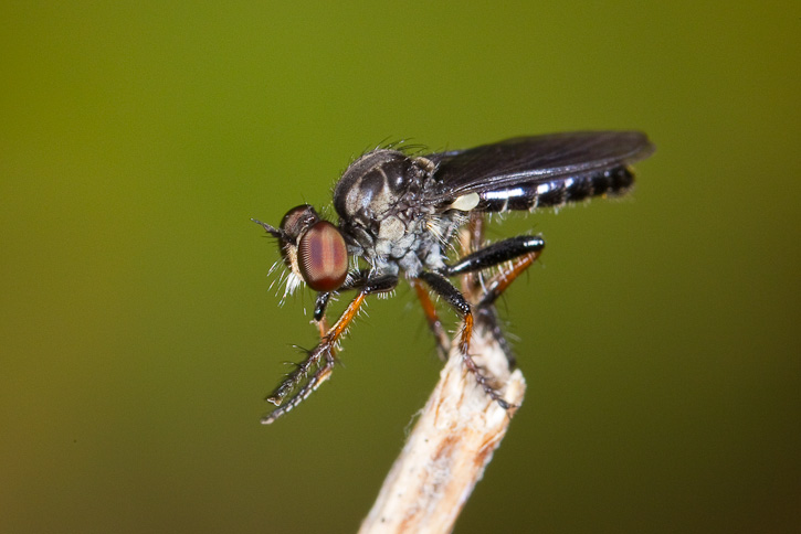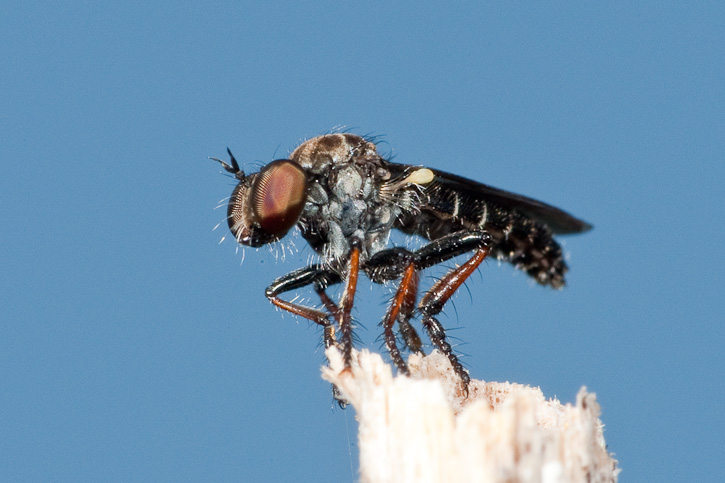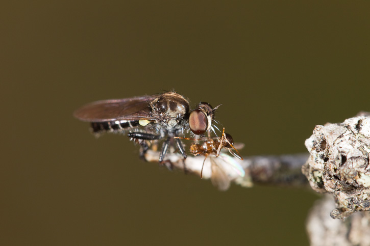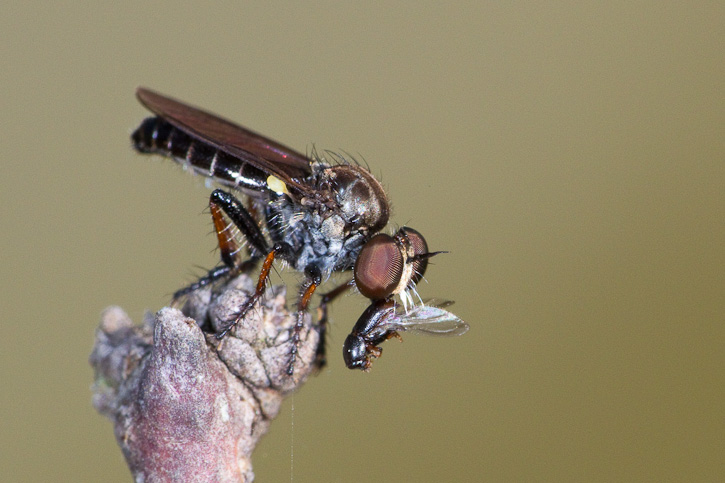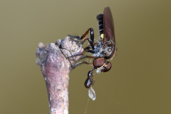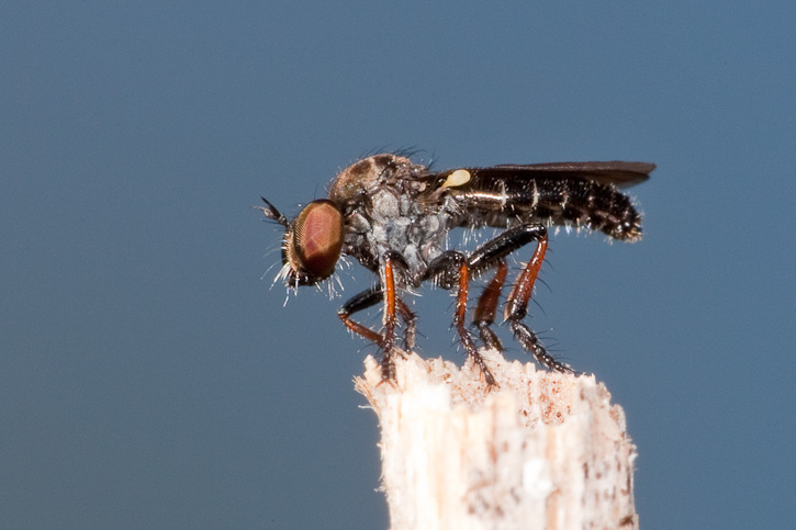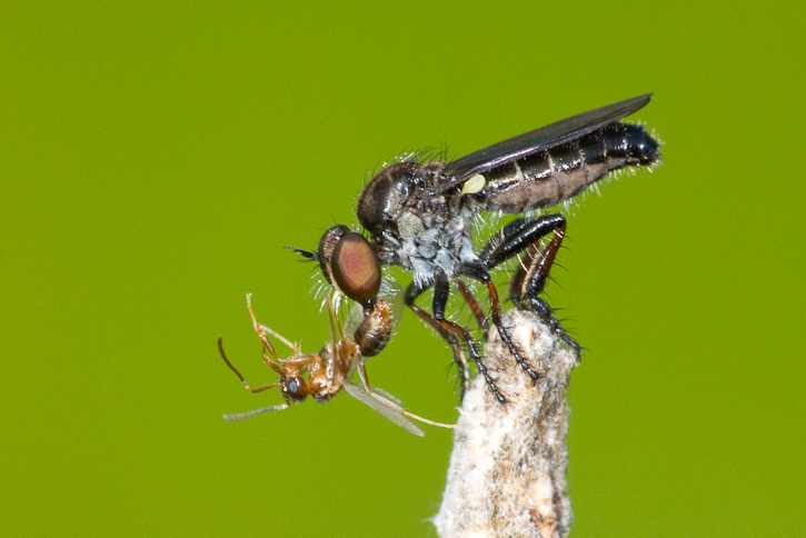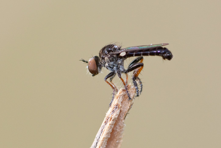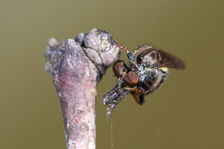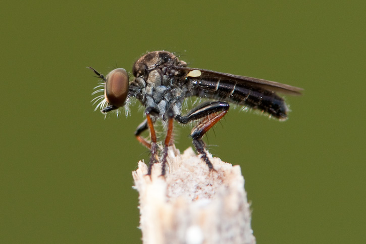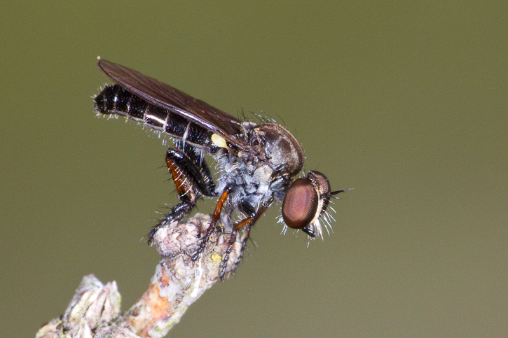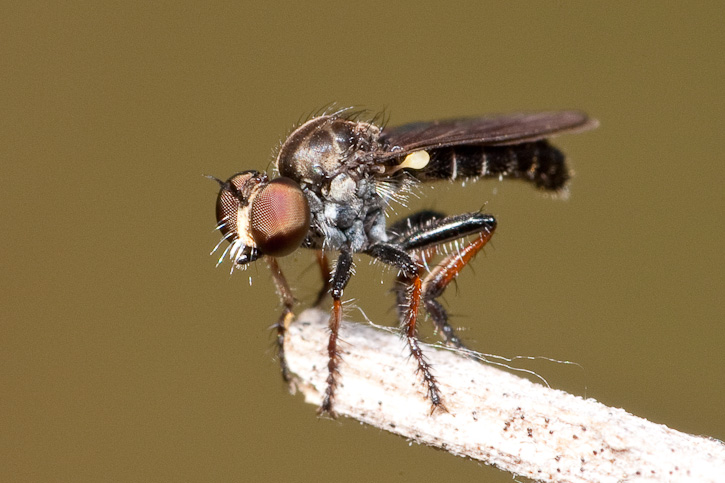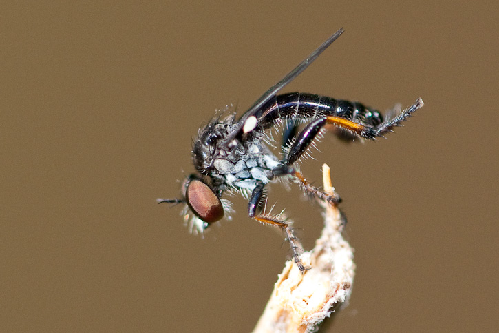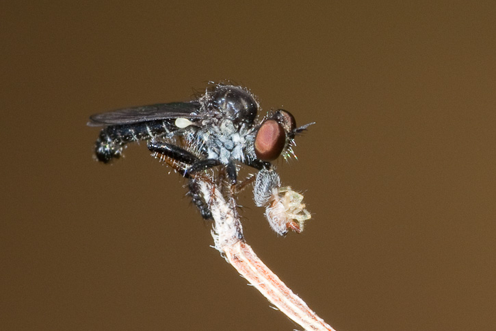 | The robber on this page is known as Hadrokolos texanus. It is a very tiny robber fly, just over 5 mm in length, as may be seen in one of the images presented here. My friend, Eric Isley, originally found these little guys at one of our local parks in Austin, Travis Co., Texas, and for a few weeks we had fun trying to get images of them before they disappeared for the season. The first 17 shots on this page were all taken in Austin, Travis Co., Texas, in August and September, 2010, with a Canon EOS 1D Mark IV. Some of the images were taken with a Canon 180mm Macro with extension tubes and the others were taken with a Canon 100mm Macro with extension tubes. I believe these photos Eric and I have of this tiny robber are likely some of the only ever taken of this species in the wild. |