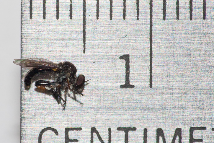 | The images of a collected specimen on a rule shows the small size of this robber fly. |