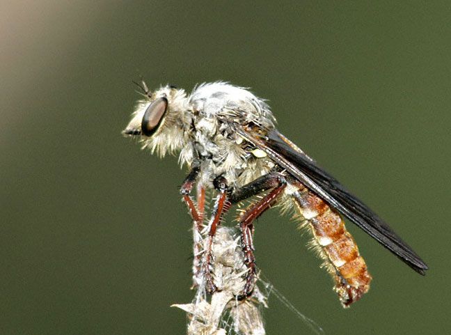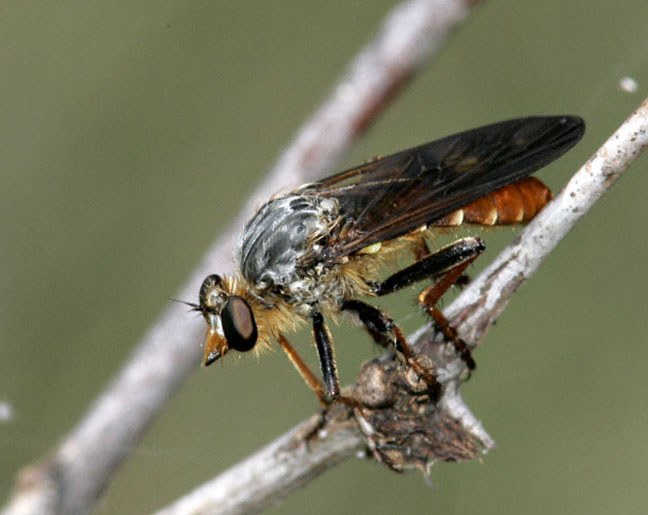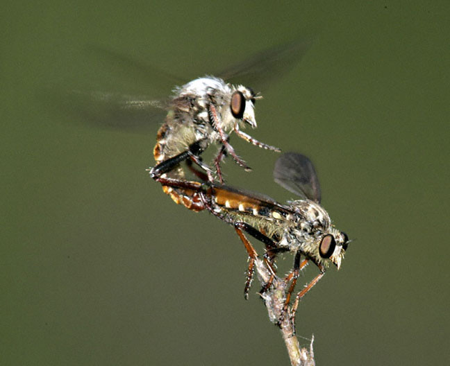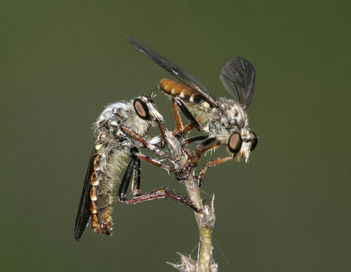 | These robber flies are known as Heteropogon patruelis and were photographed at Falcon State Park, Zapata Co., Texas in October 2004 with a Canon EOS 1D Mark II and an EF 300 mm F/4L IS lens with a 2X extender and 550 EX flash. Most of the state park is in Starr Co. (where the species was also observed), but these shots were in a part of the park within Zapata Co. My thanks to Eric Fisher and Michael Thomas for identifying this insect from these photos. Several specimens were collected in nearby Starr County for researchers. Thanks also to Herschel Raney and Rob Cannings for their help with these robbers. |