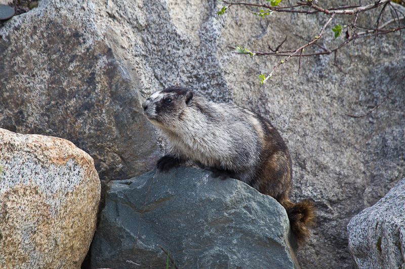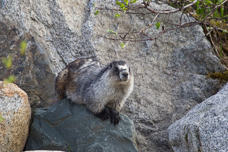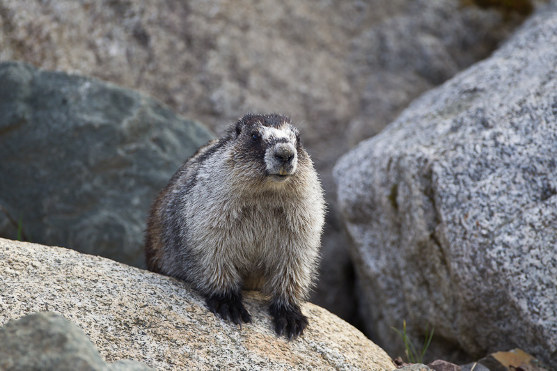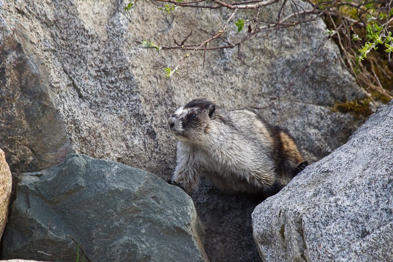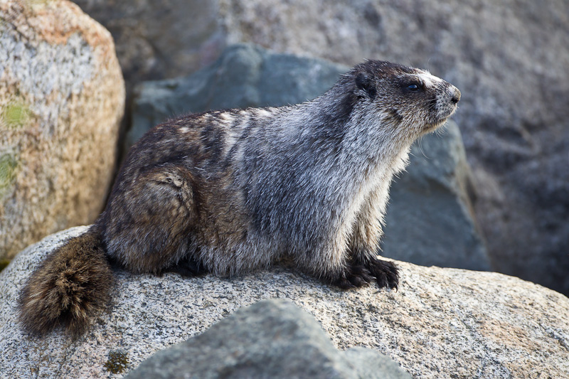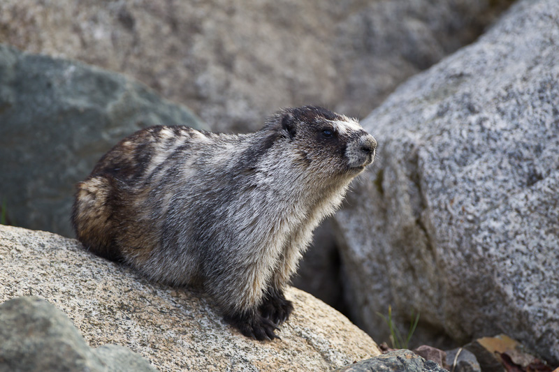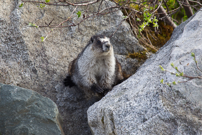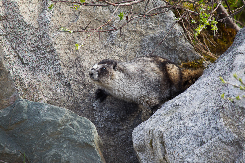 | The Hoary Marmot (Marmota caligata) is a northern marmot with a range from parts of Washington, Idaho and Montana, north across parts of western Canada and Alaska. The species typically lives in mountainous rocky areas above treeline. The shots on this page were taken at Hatcher Pass, near Palmer, Alaska, in June, 2012. | ![]() |