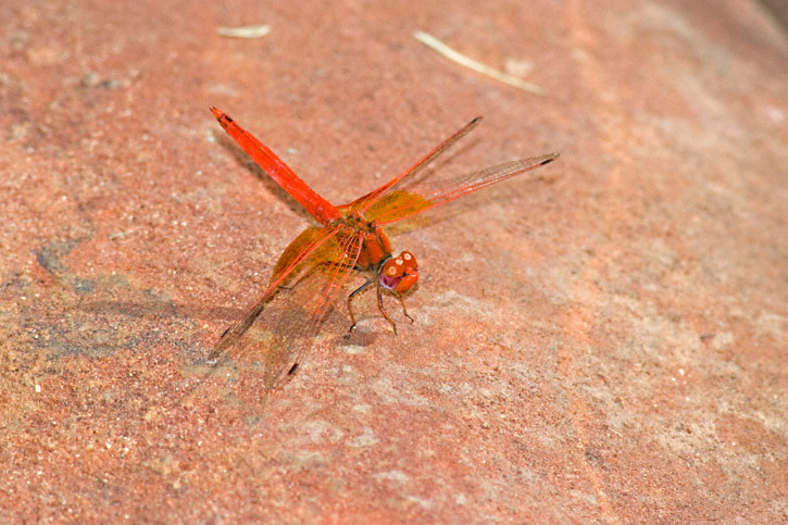 The Kirby's Dropwing (Trithemis kirbyi) is widespread over much of Africa. It occurs well into the Middle East, parts of Asia and on many islands in the Indian Ocean. The first photo of a male was taken near Nylsvley, Limpopo Province, South Africa and the next shot was taken at a pond near Nelspruit, Mpumalanga Province, South Africa. Both images were taken in January, 2006, with a Canon EOS 1D Mark II and EF 300mm F/4 L IS lens and 2X extender with a 580 flash. | ![]() |