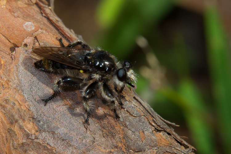 | The robber fly in the first image on this page is Laphria cinerea. This shot was taken at Caddo Pond in the Ouachita National Forest, Montgomery Co., Arkansas, in May, 2011, with a Canon EOS 1D Mark IV and a Sigma 50-500mm lens and Canon 580 flash. Thanks to Herschel Raney for this identification. | ![]() |