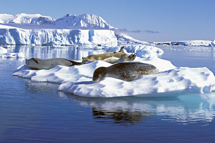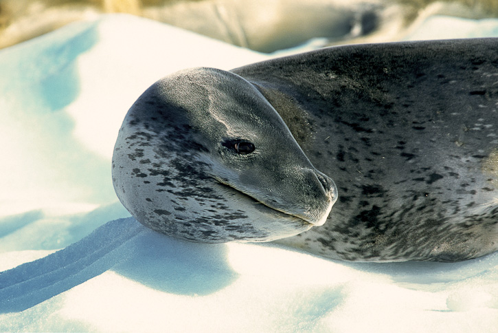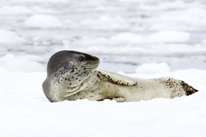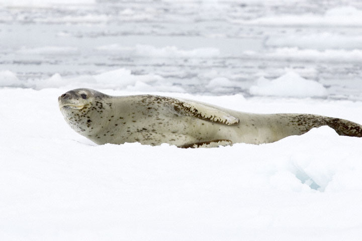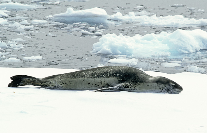 | The next three shots were taken at Penola Straight, near Peterman Island, Antarctica, in February, 2005. This Leopard Seal was resting on some ice as we circled him in a Zodiac. These shots were taken with a Canon EOS 1D Mark II and the same 70-200 lens as above. |