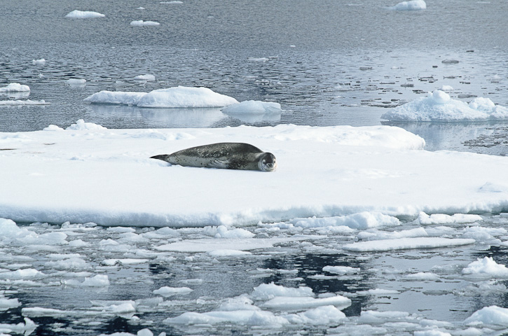 | The next two shots illustrate typical views of a Leopard Seal resting on ice as a small ship passes by. These shots were taken in January, 2002, in the Gerlache Straight, Antarctica. |