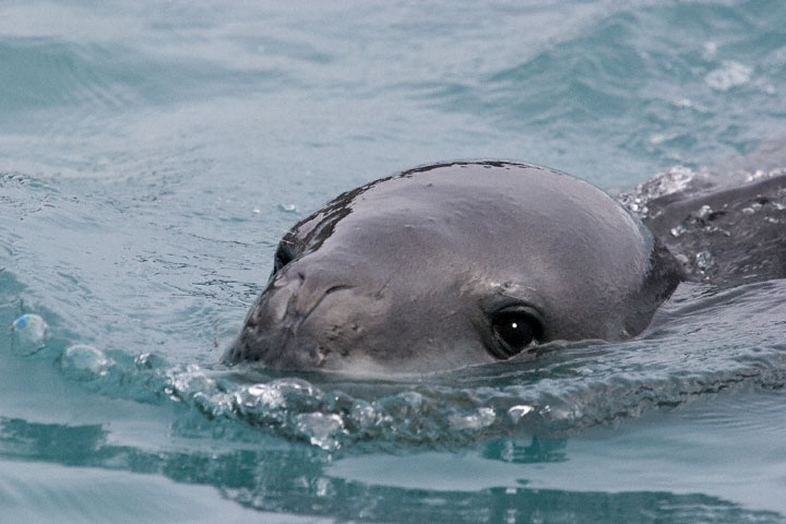 | In January, 2003, I was in a Zodiac at Elephant Island, Antarctica, when a Leopard Seal started following us. To the right is a shot of the seal peering at me from about 6 feet away. I must admit it was quite thrilling to be so close to this large predator. This digital image was taken with a Canon D60 and the same lens as above. |