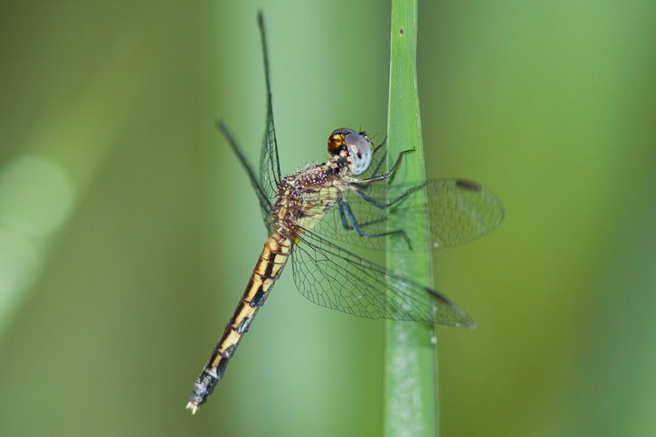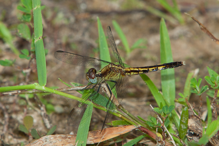 The Little Blue Dragonlet (Erythrodiplax minuscula) is a very small dragonfly of the southeastern U.S. (ranging north to Maine) where it can be found at vegetated ponds and backwaters. The photo here of a female was a digital capture in the Angelina National Forest, Angelina Co., Texas in May, 2003, with a Canon EOS 10D and EF 300 mm F4 L IS lens with a 1.4X extender and 550 EX flash. This dragon was resting on some grass at the edge of a small pond in an area that had been burned by a forest fire about 5 years earlier. | ![]() |