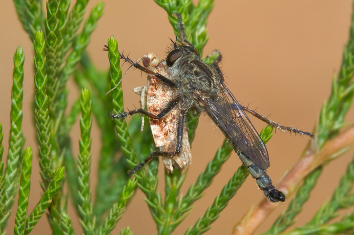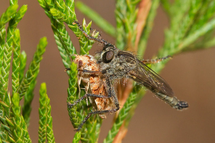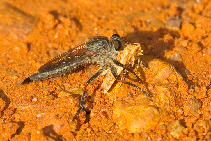 | There will be a few images of Machimus species robber flies on this page. Identification to species level is apparently not possible from these images. The first three images on this page were taken in Bastrop State Park, Bastrop Co., Texas, in April, 2011. The top two shots show a male feeding on a moth, while the third image shows a female with a moth. | ![]() |