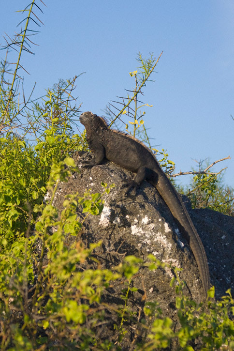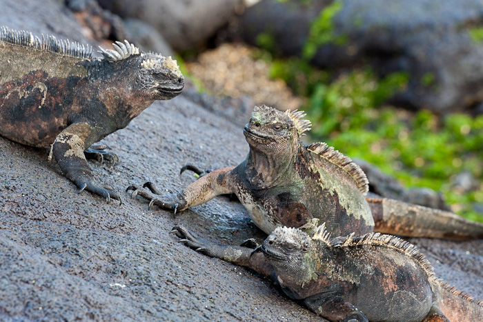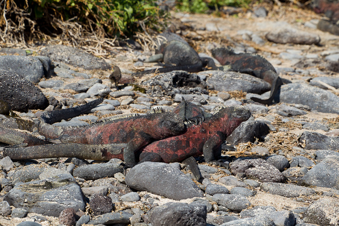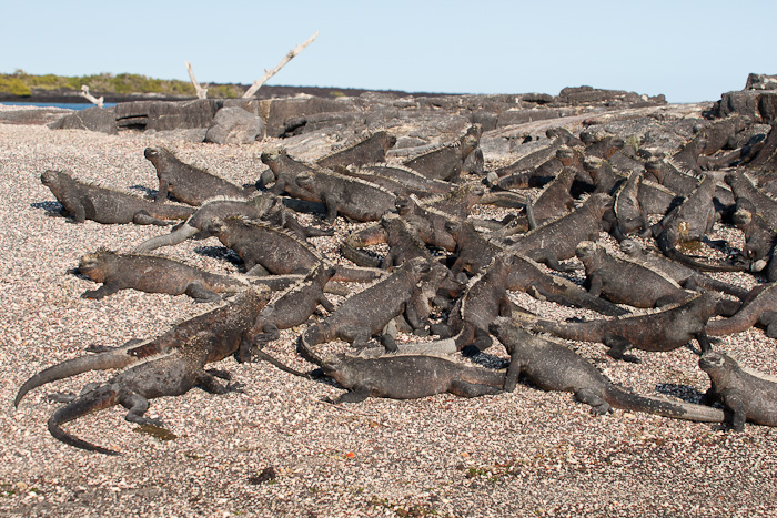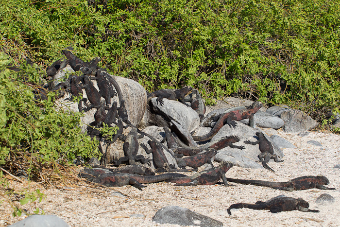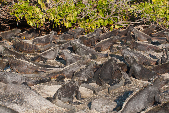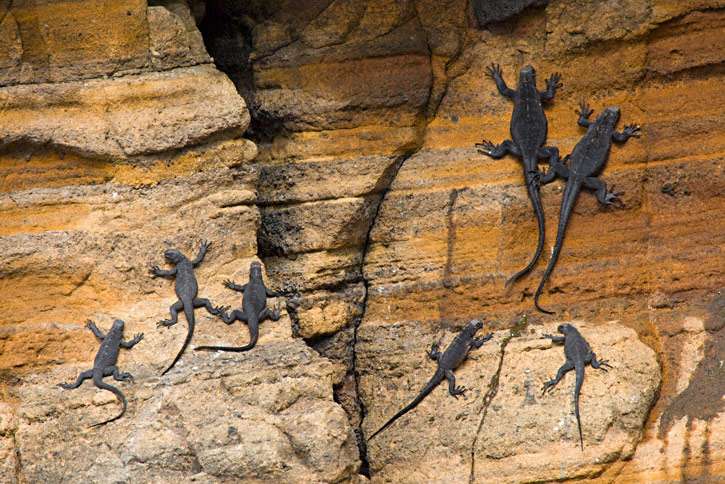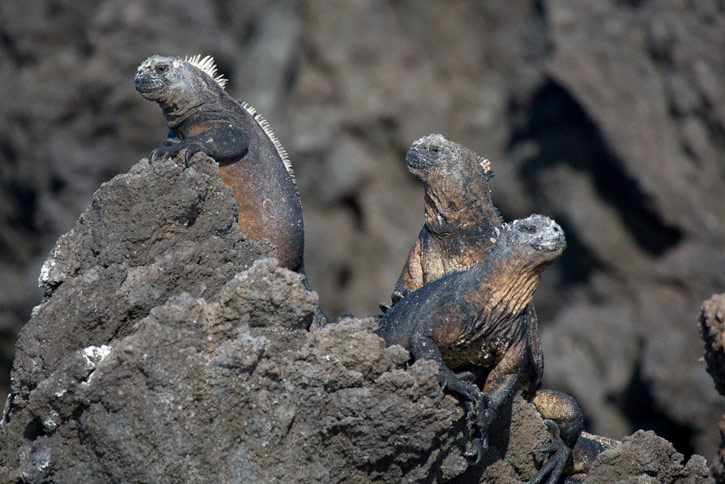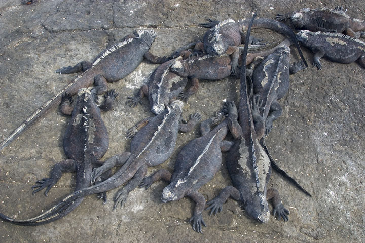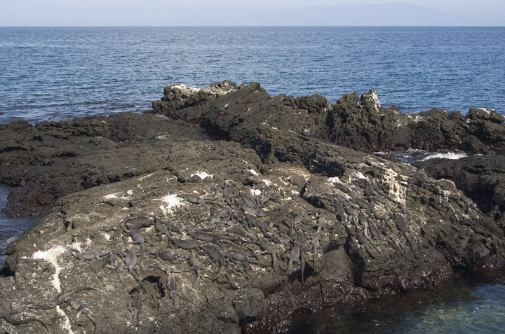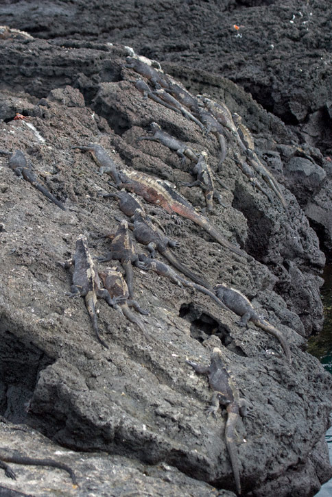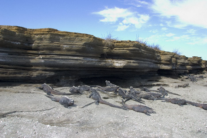 | The Marine Iguanas in the shot shown here were resting on a cliff face in the morning sun. |