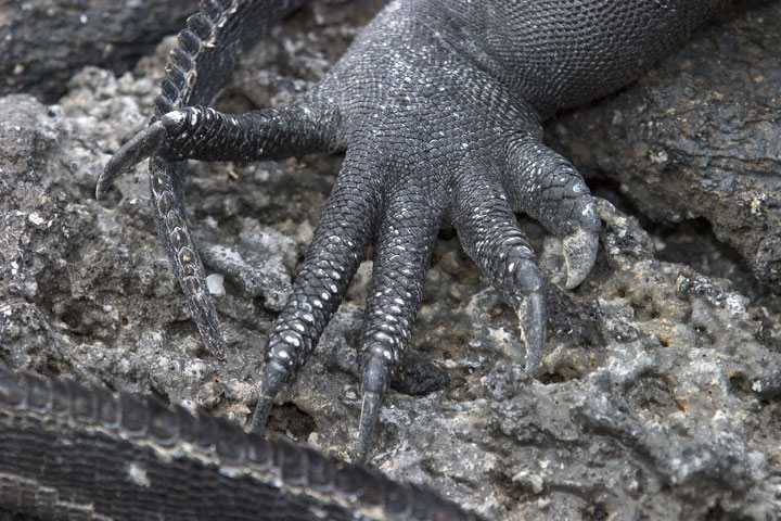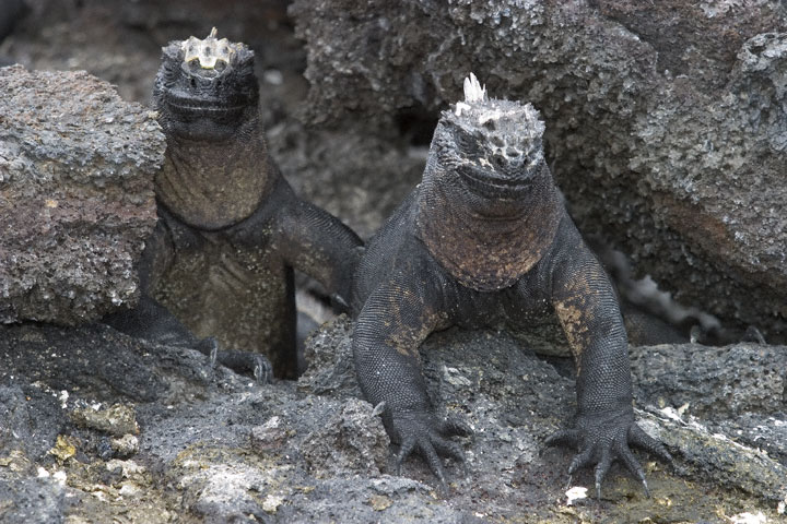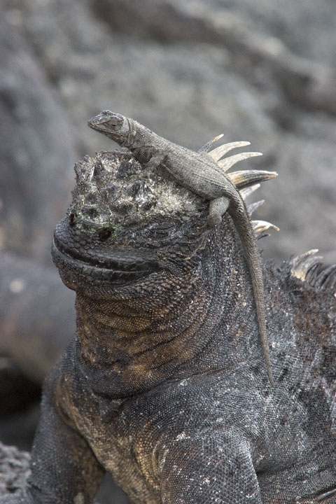| The Marine Iguana (Amblyrhynchus cristatus) is only found on the Galapagos Islands of Ecuador. This animal is highly specialized and lives on volcanic rock and sandy beaches of the islands. As the name implies, it swims freely in the cold ocean waters. The first 10 shots here just show a small collection of images of this reptile taken in July, 2003 on various islands in the Galapagos. All shots were with a Canon EOS 10D and EF 70-200mm F/2.8 L IS lens. These iguana can be differently colored from one island to another, but are mainly gray. They are larger on some islands than others as well. The 2nd shot shows a large group of iguanas basking in the sun on the dark lava rock; look closely in the bottom half of the image and you should see these guys. Shots below show various groups of iguanas, some close-ups of individuals, details of a rear foot and one shot shows a Lava Lizard (Microlophus spp.) resting on the head of a Marine Iguana. |