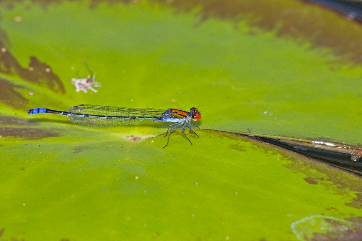 The Masai Sprite (Pseudagrion massaicum) is widespread over much of east, central and southern Africa. The species frequently perches on lily pads as shown or on other vegetation close to the water. The shot of a male shown here was taken near Nylsvley, Limpopo Province, South Africa in January, 2006, with a Canon EOS 1D Mark II and EF 300mm F/4 L IS lens and 2X extender with a 580 flash. | ![]() |