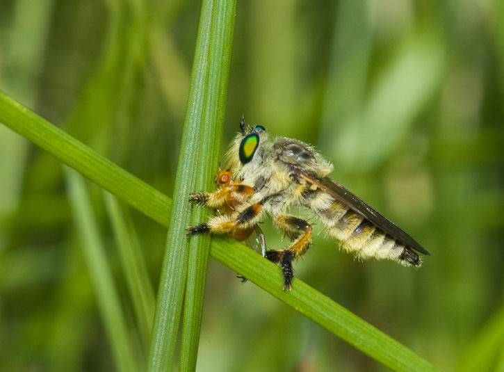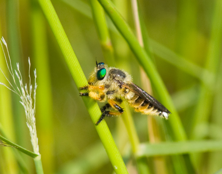 | This small robber fly is known as Megaphorus pulcher. The 3rd shot shows one with a prey item. The first 3 images shown here were taken in the Chinati Mountains, Presidio Co., Texas, in September, 2005, with a Canon EOS 1D Mark II and an EF 300mm F/4 L IS lens and 2X extender. | ![]() |