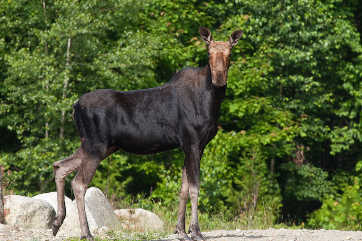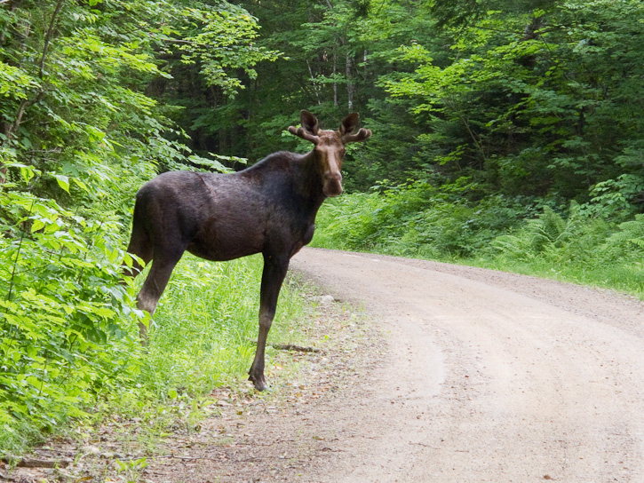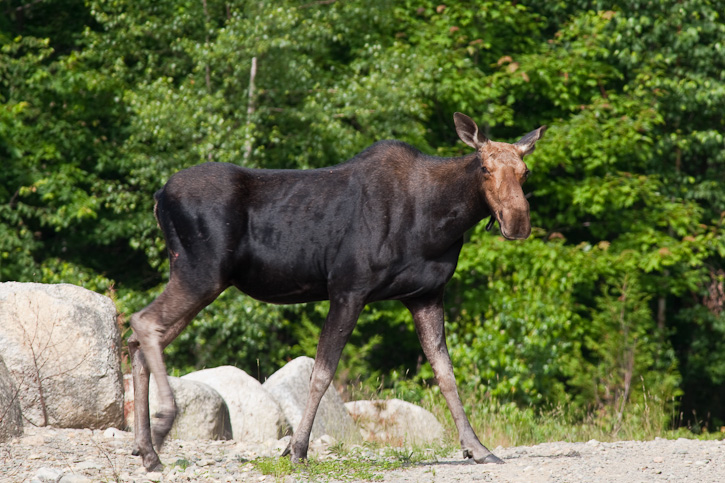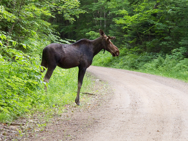 | The Moose (Alces alces) is a large member of the deer family and is about the size of a horse. In the western hemisphere it occurs across most of Canada and Alaska as well as many of the northern United States. The first 2 shots on this page show a bull with antlers just starting to grow. These 2 shots were taken in June, 2010 near North Conway, Carroll Co., New Hampshire. The next 2 shots show a cow Moose as she crossed a road south of Lee, Penobscot Co., Maine, also in June, 2010. |