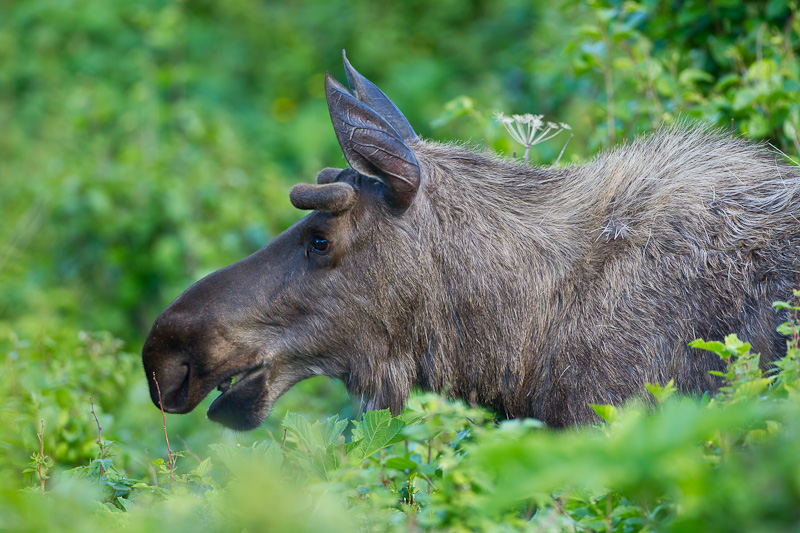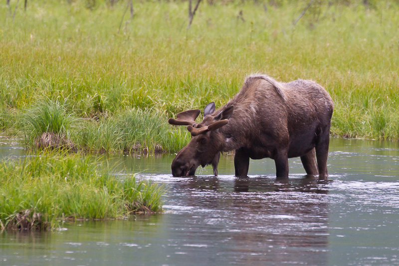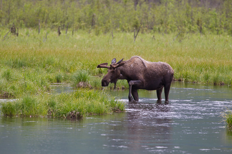 | The bull Moose, with antlers still growing in velvet, was at the Eagle River Nature Area near Anchorage, Alaska, in June, 2012. These shots were taken with a Canon EOS 1D Mark IV and an EF 70-200mm F/2.8 L IS lens and 2X extender. |
