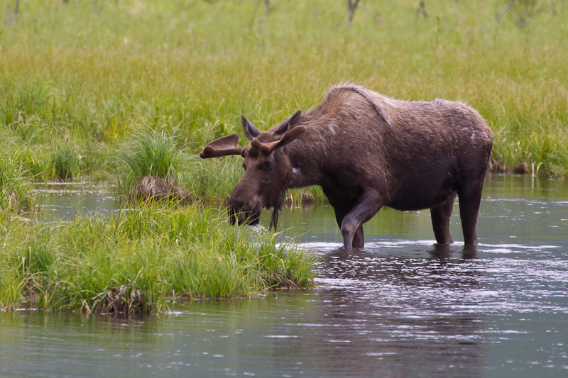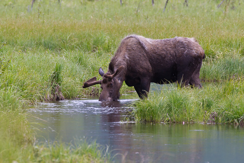 | The young bull Moose on the right was at Kincaid Park, Anchorage, Alaska, in June, 2012. This shot was taken with a Canon EOS 1D Mark IV and an EF 500mm F/4 L IS lens. |