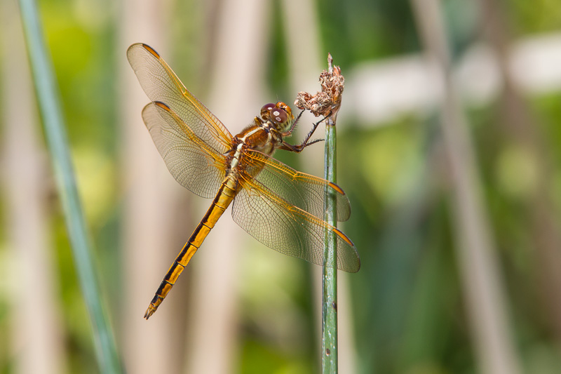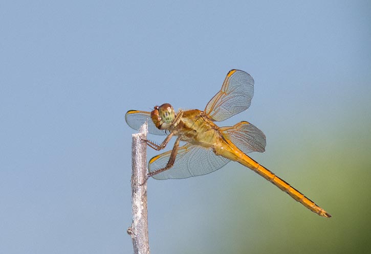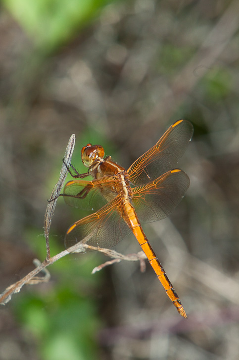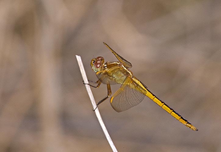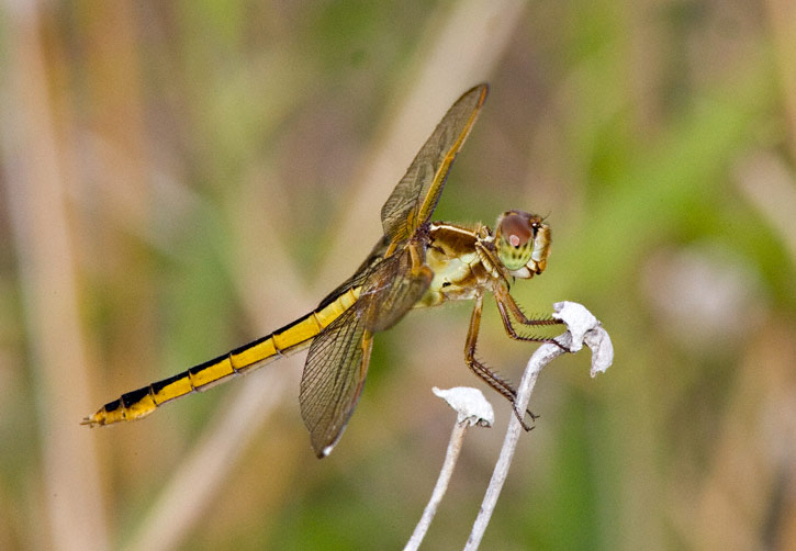 The Needham's Skimmer (Libellula needhami) is a common dragonfly of the Atlantic coast of the U.S., through Florida, and west along the Gulf coast to South Texas. It is primarily a coastal species but may often be found well inland. The shots of a worn female shown here were taken in Hidalgo Co., Texas, in August, 2005, with a Canon EOS 1D Mark II and EF 300mm F/4 L IS lens and 2X extender and 580 flash. I have a web page that compares Golden-winged Skimmer with the very similar Needham's Skimmer and provides identification comparisons. Click here if interested. |