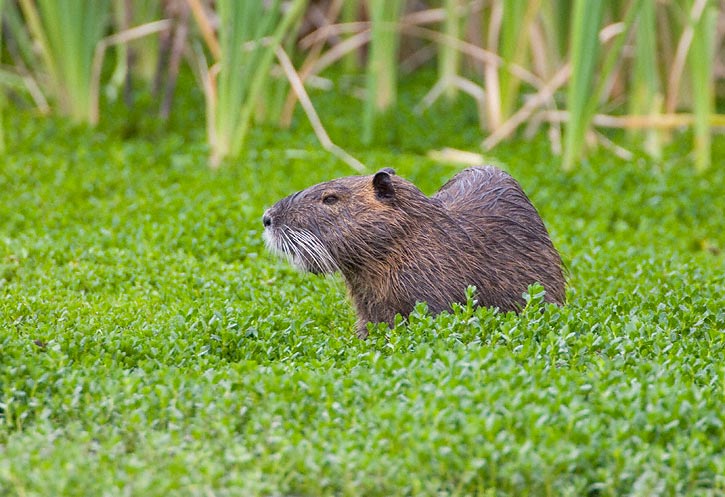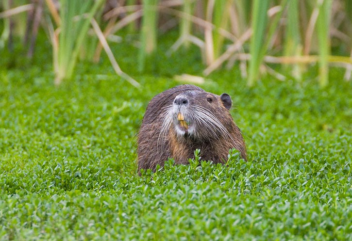 | The Nutria in the next 3 images shown here was at Port Aransas, Nueces Co., Texas, in March, 2008. These shots were taken with a Canon EOS 1D Mark III and EF 500mm F/4 L IS lens and 2X extender. | ![]() |
