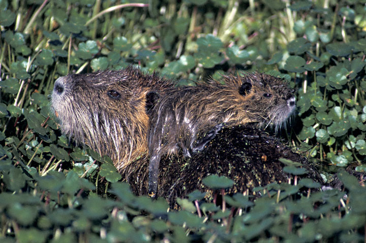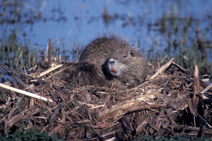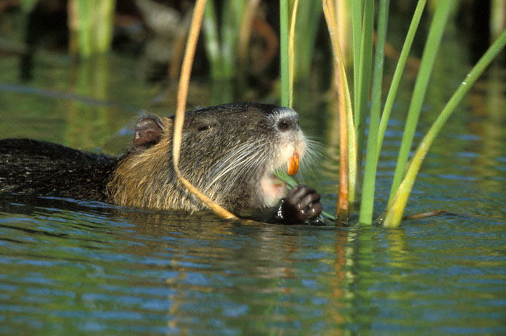 | The Nutria (Myocastor coypus) is native to South America but was introduced into the United States in the 1940s. It has become very common, in fact, quite a nuisance, in many areas, especially the southeastern U.S. The animal at right, feeding on plant material, was photographed at Port Aransas, Nueces Co., Texas, in February, 2001, with a Canon EOS 3 and EF 500mm F/4 L IS lens on Fuji Velvia. | ![]() |