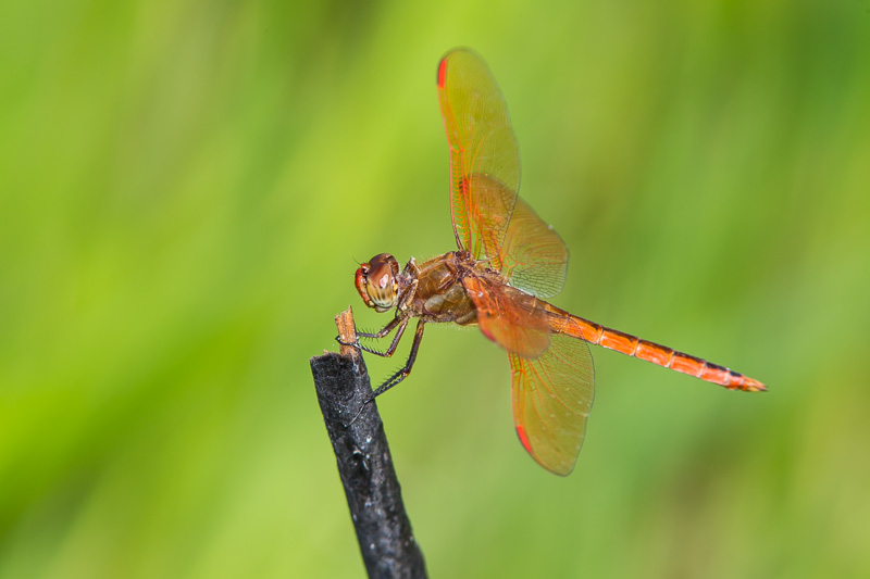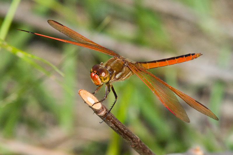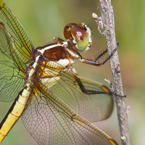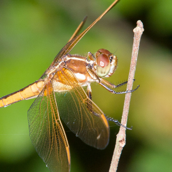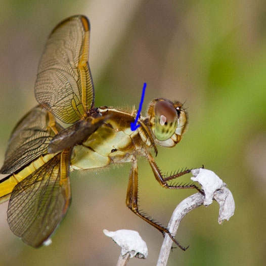 Females and young male Needham's and Golden-winged Skimmers are easier to tell apart than mature males. The shot to the right and the next one show Golden-winged Skimmers. Note the blackish upper legs as discussed above. Note also the dark front area of the thorax in these two shots. This dark area is bordered on the side of the thorax by a pale or whitish area that runs in a more or less straight line from under the wings to the base of the front legs. In other words, the pale area on the side of the thorax does not intrude into the dark area on the front of the thorax. I believe this will hold true on any female or young male Golden-winged Skimmer. I have examined many specimens in the U.T. insect collection as well as many photos and have not found an example where this was untrue. Now go two shots forward. | ![]() |