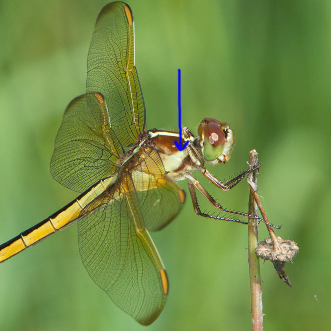 The next two shots show Needham's Skimmer. Note how the pale area on the side of the thorax intrudes into the darker area on the front of the thorax. I've indicated this with a blue arrow. Paulson describes this well as a pale "thumb" that extends forward to the front of the thorax. Again, note the brown, not blackish upper legs as discussed above for Needham's. As with Golden-winged, I have examined many specimens as well as many photos and this character holds true. | ![]() |