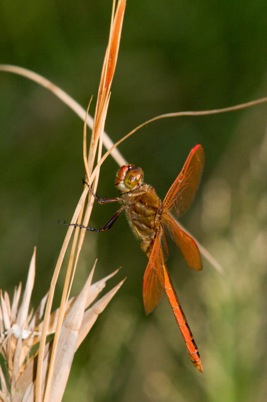 The field identification of Needham's Skimmer (Libellula needhami) (right) and Golden-winged Skimmer (Libellula auripennis) (next shot) is sometimes a little confusing for those relatively new in the field study of odonates or for those who do not know the two species in question. I am putting together a few identification hints that may help to make identifications a little easier. It should be remembered, however, that these two species are very similar in appearance and some individual insects may confound a person trying to tell them apart. The geographic ranges of the two species across the southeastern U.S. are similar, but Needham's is often, but not always, found closer to the coast. A mature male Needham's is on the right while a mature male Golden-winged is in the next shot. A mature male Needham's Skimmer tends to average more red and less orange, while the opposite would be true for a mature male Golden-winged. There is, however, great variation in color intensity within the two species. Nothing new is described here but rather I am showing some illustrations that may be of help to some folks. |