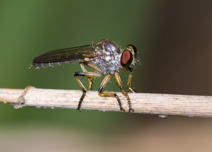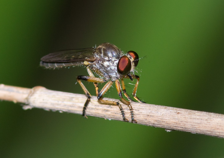 | The first 2 shots shown here show a small robber fly of the genus Ommatius. These images can not be identified to species at this time. This robber was perched on a small twig in the Sam Houston National Forest, San Jacinto Co., Texas, in June, 2008. | ![]() |