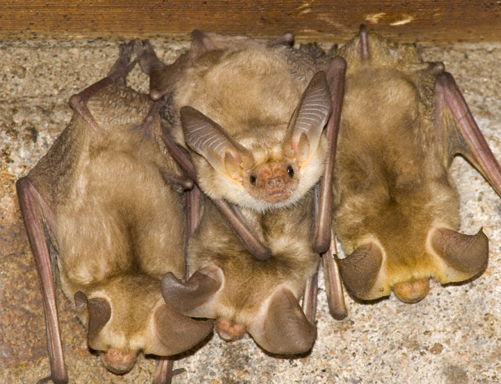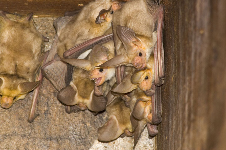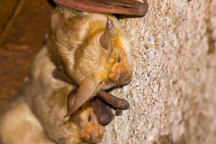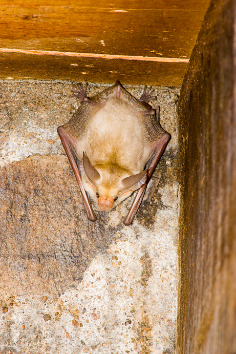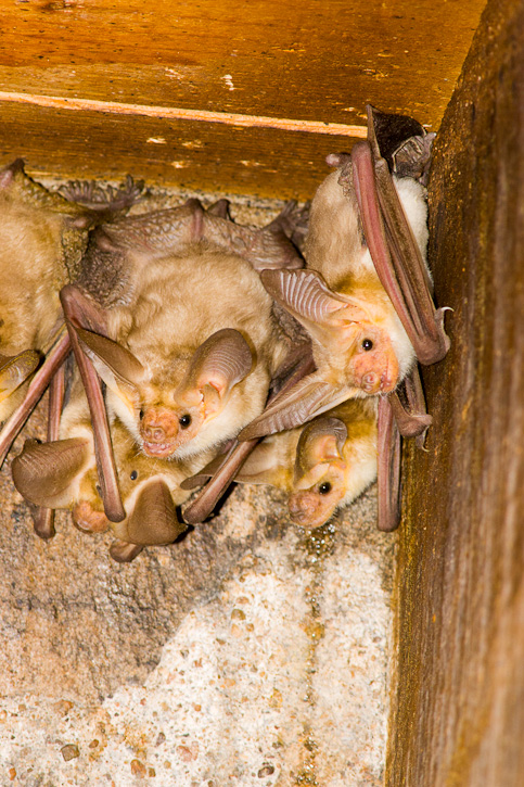 The Pallid Bat (Antrozous pallidus) occurs from western Canada southward through the southwestern United States and into Mexico. Among bats this species has the unusual behavior of catching its food on the ground rather than on the wing. The shots here show roosting Pallid Bats under the eaves of a cabin in the Chinati Mountains, Presidio Co., Texas, in September, 2005. The images were taken with a Canon EOS 1D Mark II and EF 300mm F/4 L IS lens and 1.4X extender and 580 flash. | ![]() |