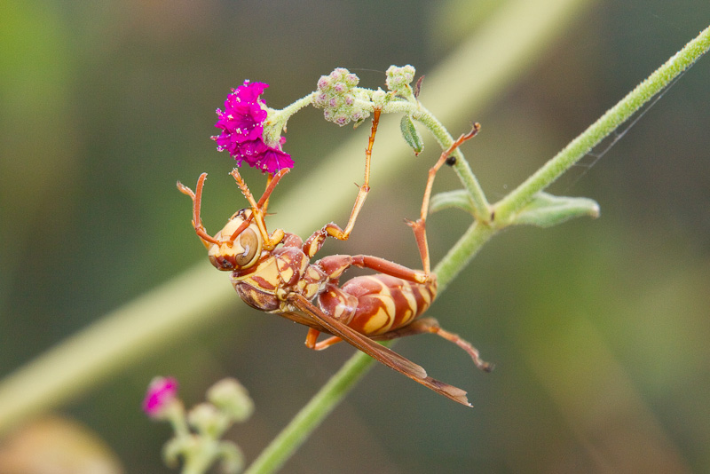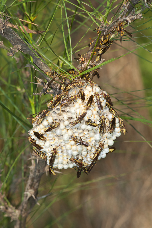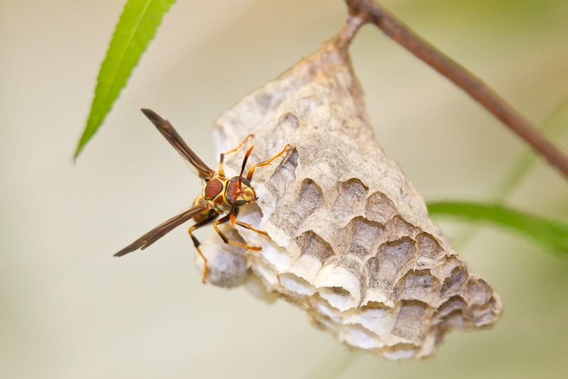 | The Paper Wasp on a nest on the right was in Austin, Travis Co., Texas, in November, 2010. The same photo gear as the previous shot was used. |