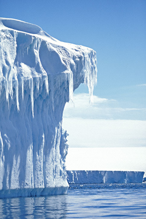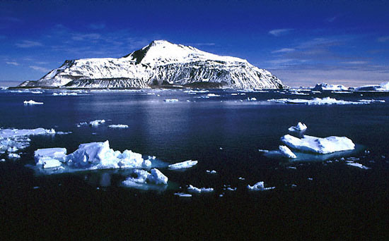 | Paulet Island is home to more than 100,000 breeding pairs of Adelie Penguins during the summer (October-February) season in Antarctica. On the photo above, taken from a ship a mile or so away, the brown area at water level in the center of the island, is all Adelie Penguins. Paulet Island is located on the east side of the Antarctic Peninsula and is often hard to reach due to pack ice. The above photo was taken in February, 2001 with a Canon EOS 3 and EF 20-35 mm wide angle lens on Fuji Velvia. The iceberg below was photographed in this same area with an EF 70-200 F2.8 lens. | ![]() |