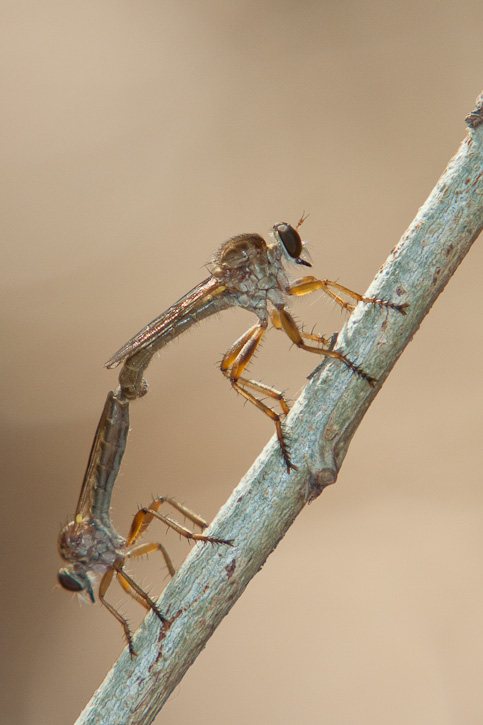 | The robber fly known as Polacantha grossa is an uncommon species in Texas. The pair in copula shown here was photographed at Santa Ana N.W.R., Hidalgo Co., Texas, in April, 2009, with a Canon EOS 50D and an EF 70-200 mm F/2.8 L IS lens and 2X extender and 580 flash. I'd like to thank Dr. Eric Fisher for making an identification based on this image. | ![]() |
