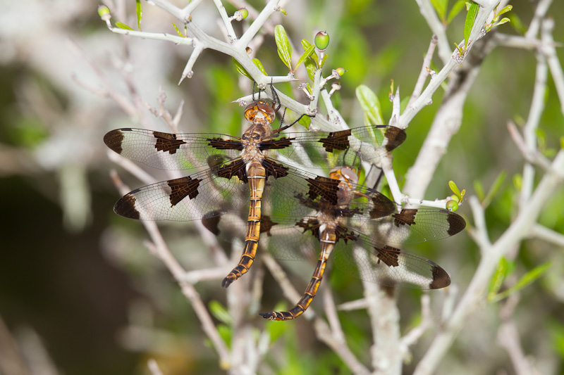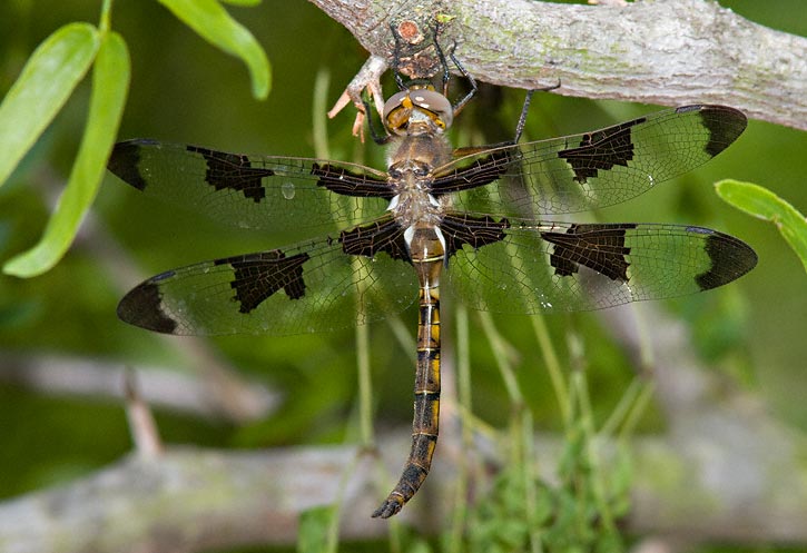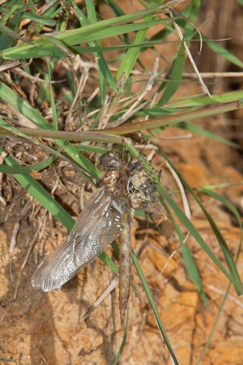 | The next 3 images show a Prince Baskettail which has just emerged from its exuviae. These 3 images were taken with a Canon EOS 50D and an EF 70-200mm F/2.8 L IS lens and 2X extender and 580 flash at Buescher State Park, Bastrop Co., Texas, in May, 2009. Note that the wings are mostly clear at this stage, but the characteristic spots will form soon. | ![]() |