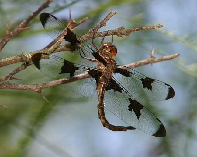 | The Prince Baskettail (Epitheca [Epicordulia] princeps) is a member of the Emerald (Corduliidae) family of dragonflies and occurs in the the eastern half of the United States. Most authorities place it in the genus Epitheca and subgenus Epicordulia. Its distinctive wing pattern and habit of perching with its abdomen partially curled upward are easy field identification characters to see. The individual shown in the first image was a digital shot in Austin, Travis Co., Texas in June, 2003, and was shot with a Canon EOS 10D and EF 70-200 mm F2.8L IS lens with a 2X extender and 550 EX flash. | ![]() |