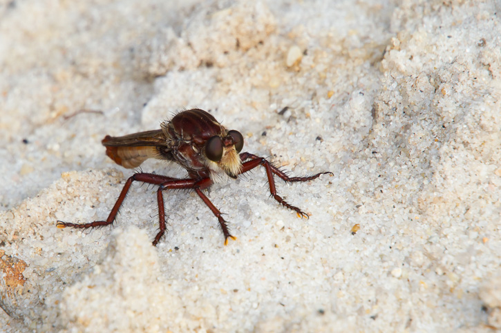 | The robber fly in the next three images on the right is known as Proctacanthus rufus. This large, reddish colored robber was found on the sandy banks of Whiskey Chitto Creek, Allen Parish, Louisiana, in May, 2011. | ![]() |