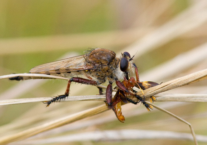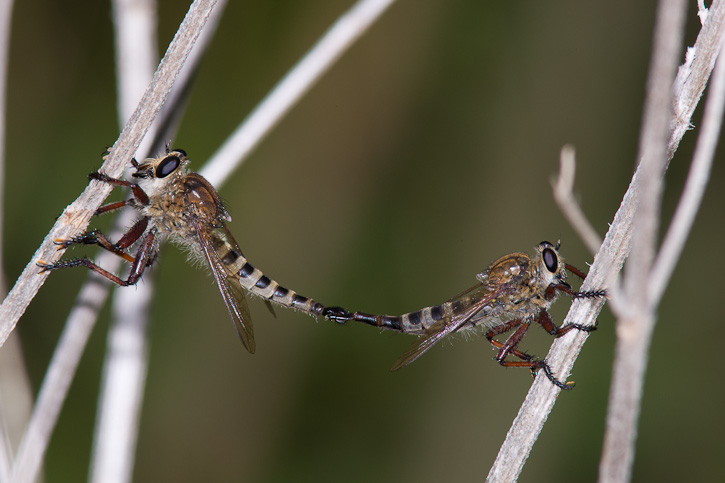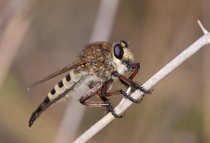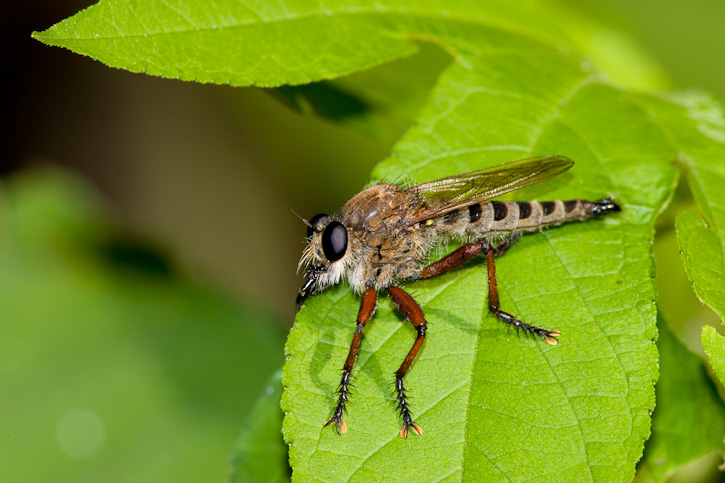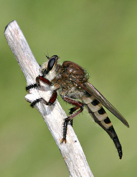 | The Promachus hinei shown here was feeding on an unknown wasp species near Millwood Lake, Howard Co., Arkansas, in September, 2007. It was shot with a Canon EOS 1D Mark III and EF 300mm F/4 l IS lens and 2X extender and 580 flash. |