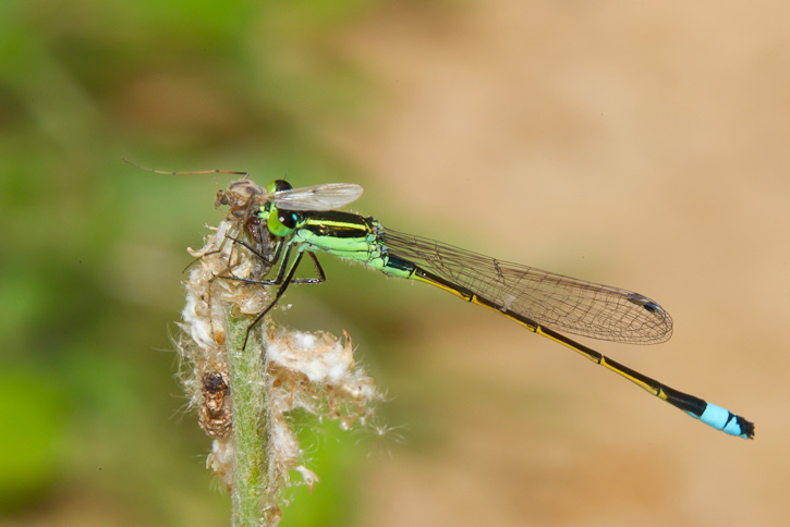 | Rambur's Forktail Ischnura ramburii young female with an Argia species as prey Hornsby Bend, Austin, Travis Co., Texas 20 April 2013 |