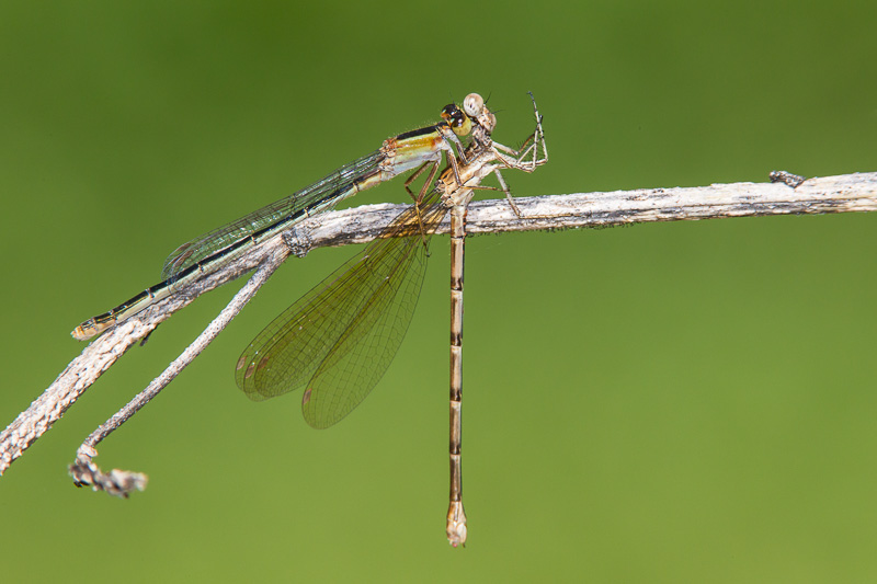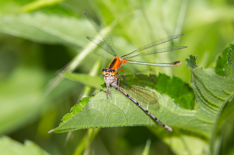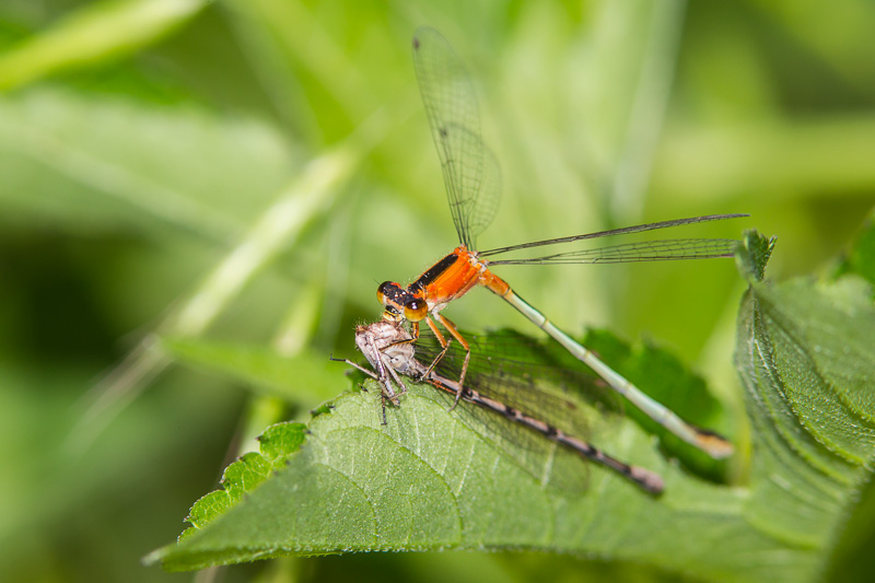 | The ability of a Rambur's Forktail to catch and feed on a variety of prey is shown by this orange-form female which has captured and is devouring a female Cream-tipped Swampdamsel. This image was taken with a Canon EOS 1D Mark III and EF 300mm F/4 L IS lens and 2X extender and 580 flash at Santa Ana N.W.R., Hidalgo Co., Texas, in May, 2009. | ![]() |