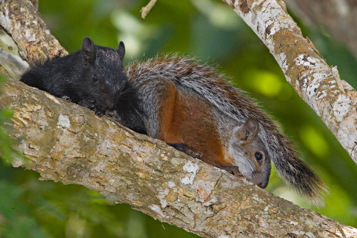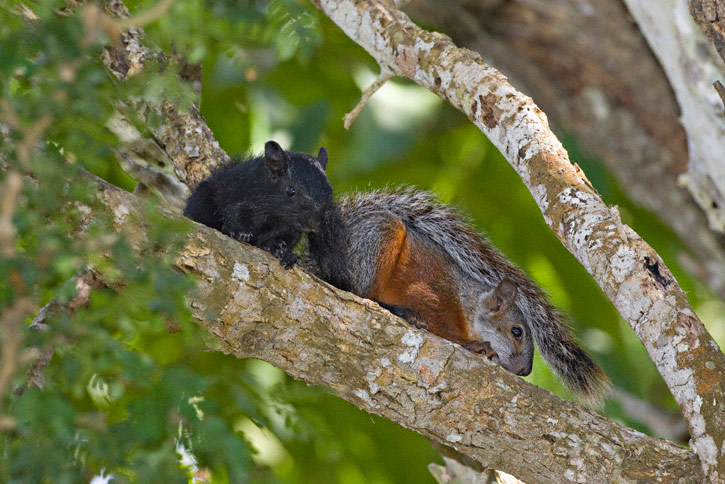| The Red-bellied Squirrel (Sciurus aureogaster) is a tropical resident tree squirrel of Mexico and parts of Central America. There is also an introduced population of this species in south Florida. The two shots shown here were taken in southern Tamaulipas, Mexico, in May, 2007, with a Canon EOS 1D Mark II and EF 500mm F/4 L IS lens. The black individual is a color morph which is fairly common. My thanks to John Koprowski at the University of Arizona for the identification of this species from my images. | ![]() |