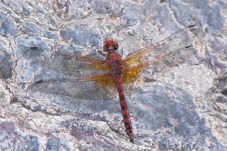 | The Red Rock Skimmer (Paltothemis lineatipes) occurs across much of the southwestern United States, parts of Mexico and southward to Costa Rica. It often can be found flying up and down sunny, rocky streams in deserts or in mountain regions. The first two shots here were taken with a Canon EOS 1D Mark II and an EF 300 mm F/4L IS lens and 2X extender and 580 EX flash. These images were taken along the San Carlos River in Gila County, Arizona in April 2005. | ![]() |