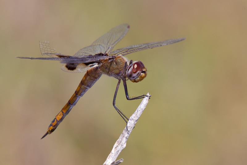 | Another female Red Saddlebags. This one was in Austin, Travis Co., Texas in March, 2009. This image was taken with a Canon EOS 1D Mark III and EF 300mm F/4 L IS lens and 2X extender and flash. This individual is eating another insect. | ![]() |