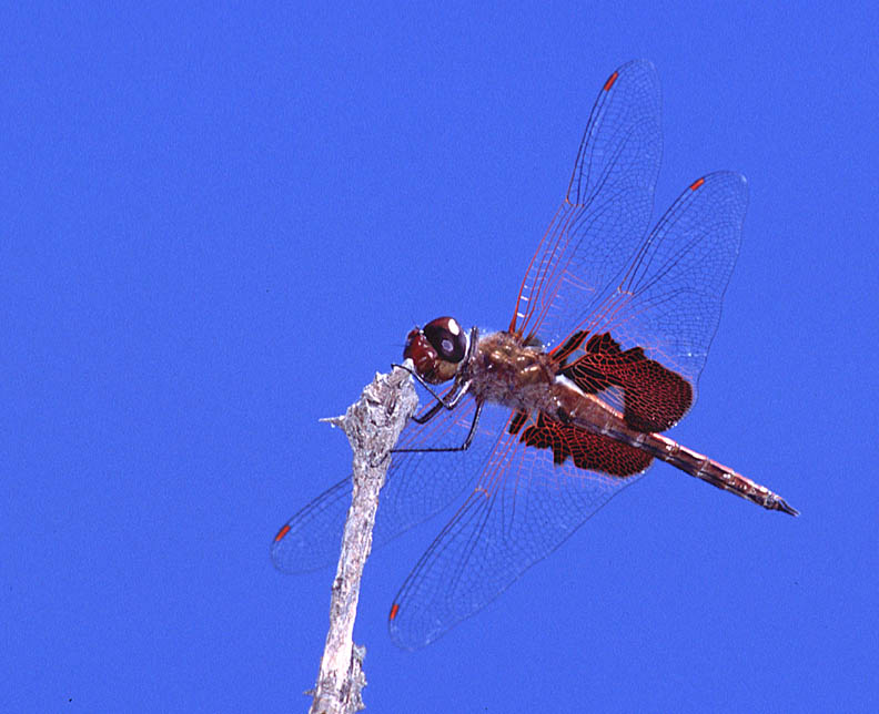 | The Red Saddlebags (Tramea onusta) is a member of the group of dragonflies known as Saddlebag Gliders. They get this name from the dark band at the base of each hind wing which might look somewhat like saddlebags. The image on the right was shot in July, 2002, in Austin, Travis Co., Texas with a Canon EOS 1V and EF 300mm F4L IS lens with a 2X extender on Fuji Provia F. | ![]() |