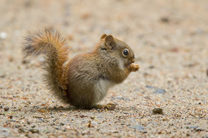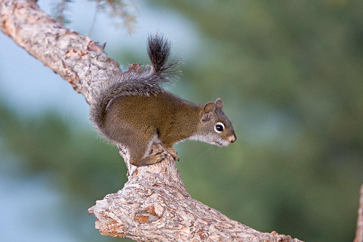 | The Red Squirrel (Tamiasciurus hudsonicus) is the smallest tree squirrel in its range and occurs across most of Canada as well as Alaska and much of the western regions of the lower 48 states. It is also known as the "Pine Squirrel" and "Chickaree" in some areas. The individual in the top image was photographed near Loomis, Okanogan Co., Washington in June 1998, with a Canon T90 and a Canon 400 mm f5.6 lens on Fuji Sensia. |