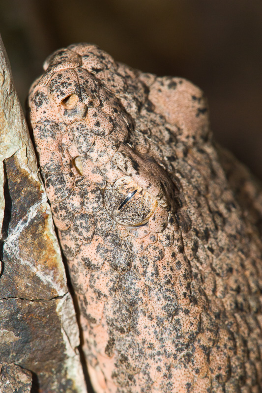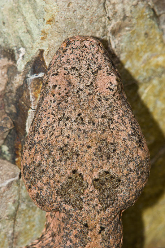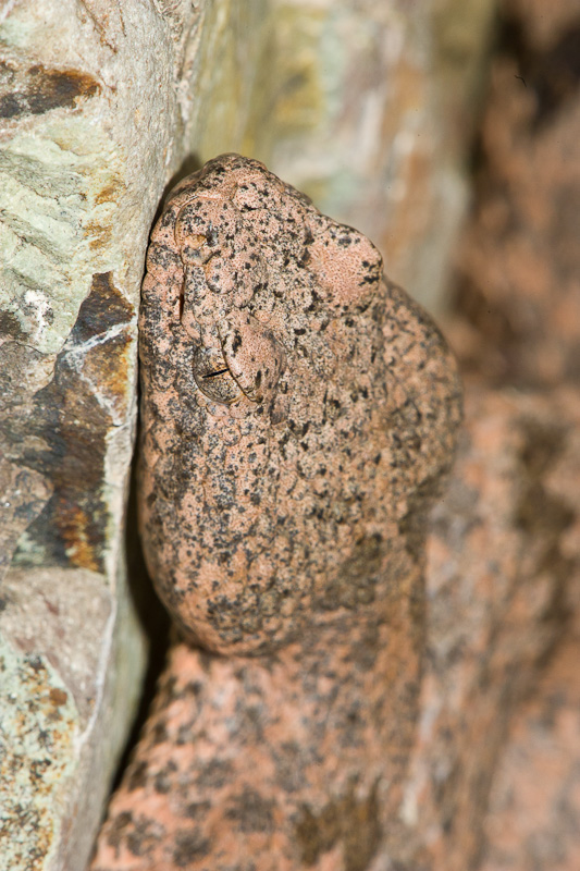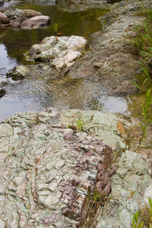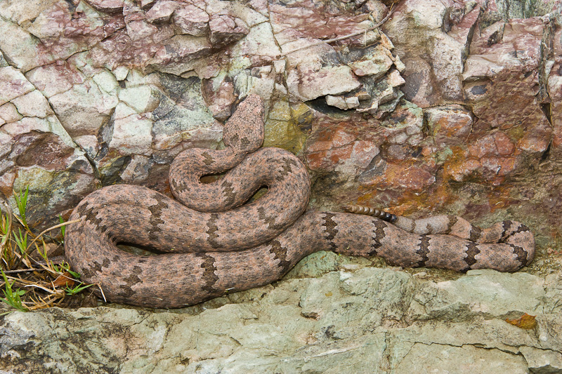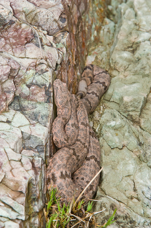 | The Rock Rattlesnake (Crotalus lepidus) is fairly common across much of southwest Texas, but sometimes it can be hard to find one. In my opinion, it is one of the most beautiful rattlesnakes in Texas with its subtle gray and sometimes pinkish coloration. They are experts at camouflage, and sometimes you can be upon one before you realize it. This series of photos will illustrate that point. Fortunately, the species is often very inoffensive unless treated badly. Rock Rattlesnakes are quite variable in their overall coloration depending upon the terrain and rock type where they live. I have seen some individuals that are very dark gray, while others, such as the one on this page, are actually quite pink. In September, 2004, I was walking along a stream in northern Presidio Co., Texas looking for dragonflies and damselflies when I encountered the scene on the right. Note the Rock Rattlesnake in the lower right of the image. It was a cool morning and the snake was pressed up against a rock in a position that I assumed indicated it was trying to take advantage of what little sunshine was available. I have since been told by Chris Harrison of San Antonio, that this is a fairly typical hunting position for this species which may remain for hours or even days waiting for an unsuspecting prey item to come over the edge of the rock. I took a number of digital shots with a Canon EOS 1D Mark II and EF 180mm Macro and 550 EX flash. I moved all around the snake during this photo session, but it barely moved during the 15 or 20 minutes I spent with it. An hour and a half later I came back by this same location and the Rock Rattler was still there and still in the same general position. The first seven images here were taken at that time. |