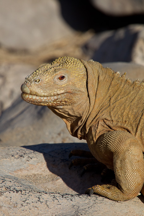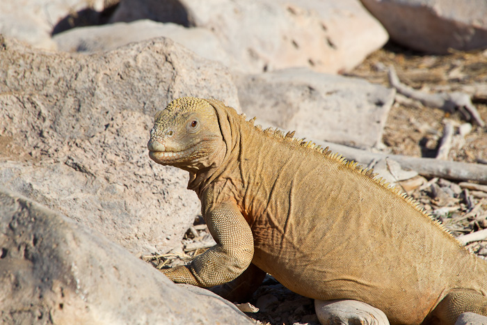 | The Santa Fe Land Iguana (Conolophus pallidus) only occurs one Santa Fe Island in the Galapagos, so it is truly a rare and endangered animal. It is related to the Land Iguana, which is more widespread on the Galapagos. The first two shots on this page were taken in August, 2010, on Santa Fe Island with a Canon EOS 1D Mark IV and a Sigma 50-500mm lens. | ![]() |