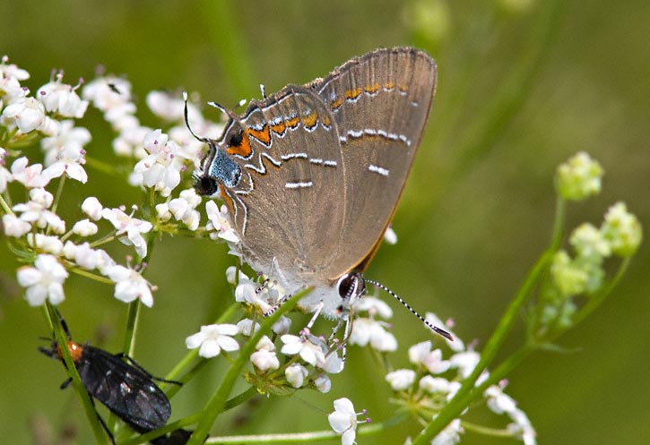 The Soapberry Hairstreak on the rigt was in Austin, Travis Co., Texas, in May, 2011. This shot was taken with a Canon EOS 1D Mark IV and a Sigma 50-500mm lens and Canon 580 flash. |