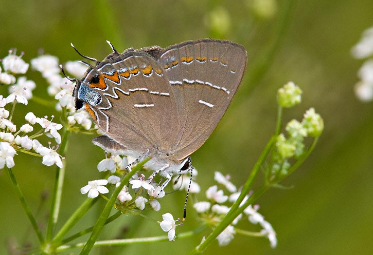 The Soapberry Hairstreak (Phaeostrymon alcestis) is a localized butterfly of parts of Texas, Kansas, Oklahoma, Arizona, and New Mexico. It is seldom found far from its larval food plant, soapberry trees but sometimes feeds on nearby blooming plants. The first 2 shots on this page were taken in May, 2008, at the Nails Creek Unit of Lake Somerville State Park, Lee Co., Texas, with a Canon EOS 1D Mark III and EF 300mm F/4 L IS lens and 2X extender and flash. |