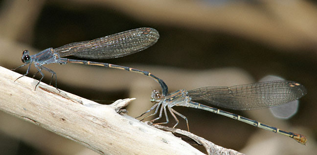 | The Sooty Dancer (Argia lugens) is a large, dark damselfly of the southwestern U.S. and Mexico. It often perches on rocks in stream beds. The first shot was taken in the Chinati Mountains of Presidio Co., Texas in September 2004 with a Canon EOS 1D Mark II and EF 300 mm F/4 L IS lens with a 2X extender and 550 EX flash. The next shot of the pair in tandem was taken with the same equipment, also in September, 2004, but at Big Bend Ranch State Park in Presidio Co., Texas. | ![]() |