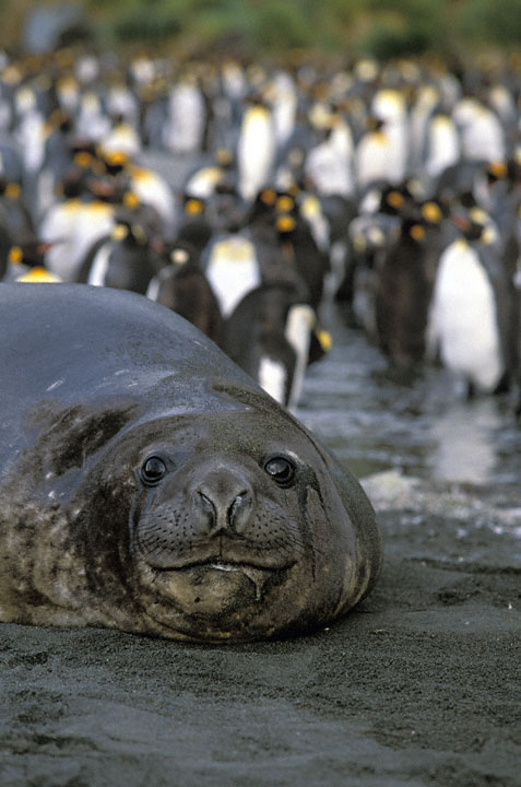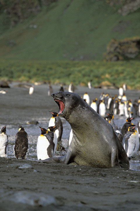 | The Southern Elephant Seal (Mirounga leonina) is a huge beast. Males can be 14 or 15 feet long and weigh 7000 pounds or more. Females average 7 to 8 feet long and weight 1500 pounds or so. Elephant Seals are amazing divers and have been documented at depths of 3000 feet and may remain underwater for 2 hours. The species is quite ungainly on land, but is a masterful swimmer. During the austral summer, these animals often come ashore on Antarctic and Sub-Antarctic islands to lounge on the beaches and moult their skin. Many may lay together, belching from both ends, to produce a visual and olfactory experience never to be forgotten. The animal at right was on the beach at Gold Harbor, South Georgia, in January, 2002, and was photographed with a Canon EOS 1V and EF 70-200mm F/2.8 L IS lens and 1.4X extender on Fuji Velvia. The same data goes with the next two images which show King Penguins in the background. The animal with its mouth open was a young male offering a challenge to another nearby animal. |