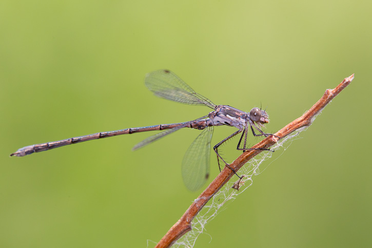 | The Spotted Spreadwing (Lestes congener) is a widespread damselfly ranging across much of the United States except for the deep south and Texas. The two black marks on the underside of the thorax is where it gets its common name. The first ten shots on this page were taken on the Brett Gray Ranch, a Nature Conservancy property, in Lincoln Co., Colorado, in July, 2011. These shots were taken with a Canon EOS 1D Mark IV and a Sigma 50-500mm lens and Canon 580 flash. The one of the right is a teneral individual. |