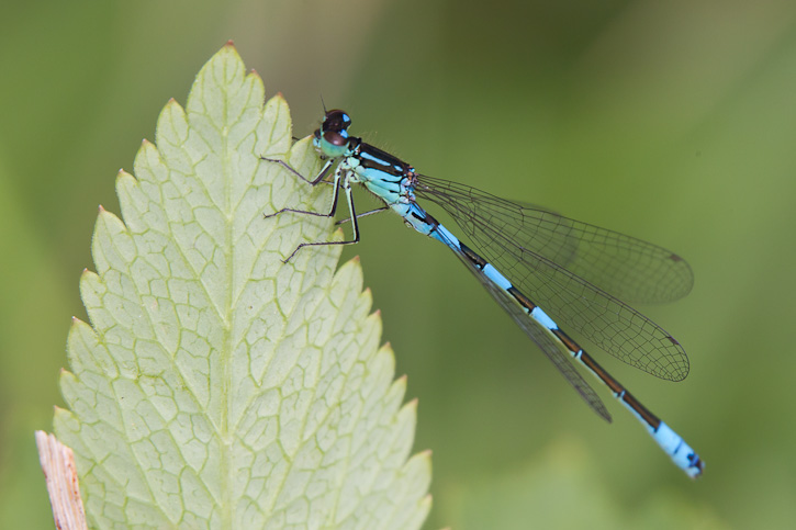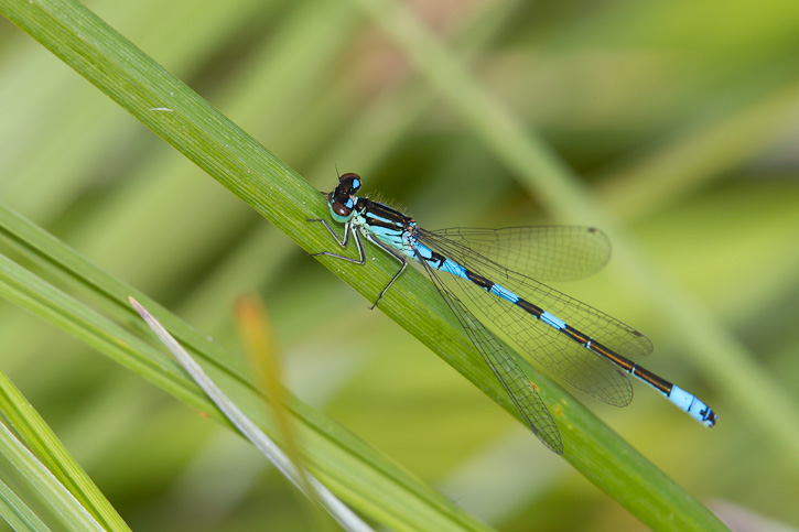 | The Taiga Bluet (Coenagrion resolutum) is widespread and common in marshes across the northern United States. In some areas it is only found at higher elevations. The first nine shots on this page were taken at Parvin Lake, near Fort Collins, Larimer Co., Colorado, in July, 2011, with a Canon EOS 1D Mark IV and a Sigma 50-500mm lens and Canon 580 flash. A male is shown in the first two images. | ![]() |